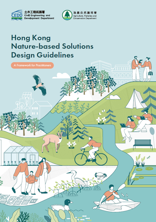 The Hong Kong Nature-based Solutions Design Guide (HKNbSDG), jointly published by the Civil Engineering and Development Department and the Agriculture, Fisheries and Conservation Department, provides practical guidance on the planning and design of Nature-based Solutions (NbS) into infrastructure works and development projects. It aims to balance city development with ecological conservation while improving Hong Kong’s climate resilience and urban sustainability. The HKNbSDG draws on global, national and local publications and incorporates Hong Kong’s ecological urban development characteristics, alongside actual local circumstances. The three main principles include: (1) promoting ecosystem diversity at multiple scales; (2) embracing human-nature coexistence for mutual benefits; and (3) improving resilience through Nature-based Solutions.