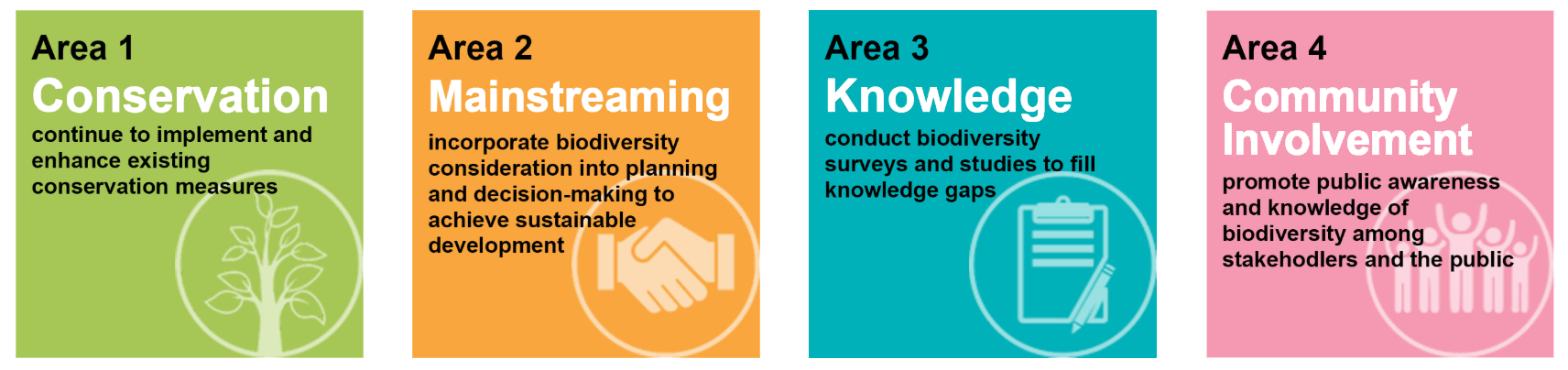 Being the first BSAP for Hong Kong, in addition to enhancing conservation measures for biodiversity, we consider that our priority should be on mainstreaming biodiversity so as to create an enabling environment. Sustained efforts will also be put into education and promotion of public awareness, which are the cornerstone of conservation and sustainable use of biodiversity. Areas of actions under the BSAP include: