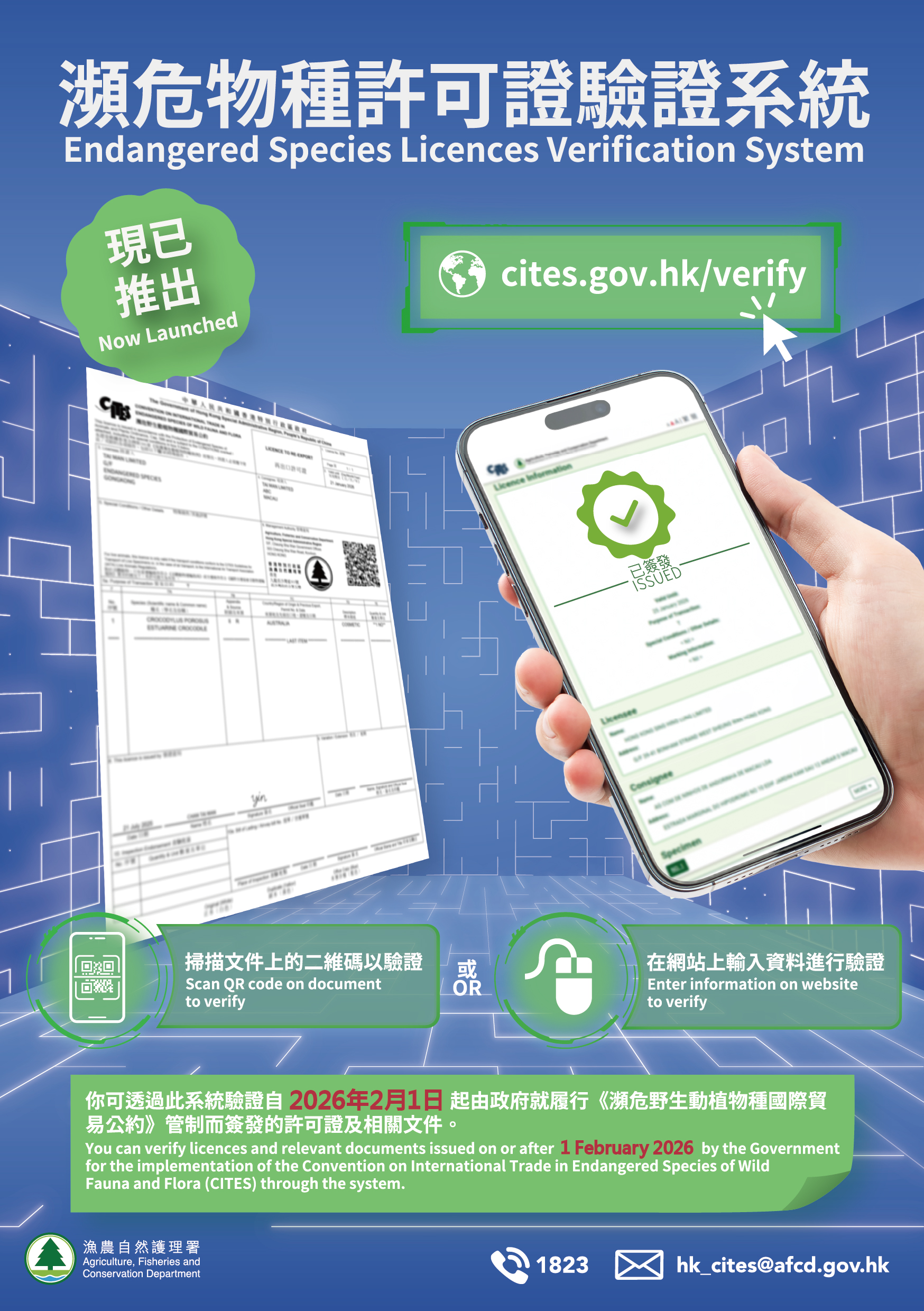 This system is for the verification of licences and relevant documents issued on or after 1 February 2026 by the Government of the Hong Kong Special Administrative Region for the implementation of the Convention on International Trade in Endangered Species of Wild Fauna and Flora (CITES). You can scan QR code on document or enter information on website (cites.gov.hk/verify) to verify. The CITES Secretariat also issued a notification (CITES notification No. 2026/012) on 20 January 2026 informing Parties.