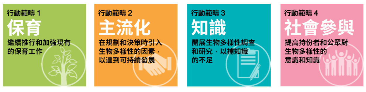 作為香港首份《計劃》,除了提升生物多樣性的保育措施,我們認為把生物多樣性主流化應是首要任務,以為往後的保育工作締造更有利的環境。我們亦會繼續致力進行教育和提高公眾意識的工作,這是生物多樣性得到保育和持續利用的基石。《計劃》中具體行動的範疇包括: