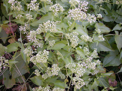 薇 甘 菊 長 有 對 生 的 心 形 葉 片 , 長 3 至 13 厘 米 , 葉 緣 有 不 規 則 的 粗 鋸 齒 ; 莖 細 長 , 多 分 枝 , 無 毛 至 略 被 毛 ; 花 呈 白 色 , 細 小 且 有 微 香 , 於 枝 端 簇 成 細 小 的 頭 狀 花 序 ; 乾 果 細 小 , 呈 黑 色 , 頂 端 的 白 色 冠 毛 有 利 風 力 傳 播 。