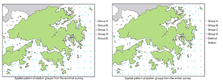 夏 、 冬 兩 次 的 調 查 結 果 顯 示 , 沉 積 物 的 特 點 兩 季 的 差 別 很 小 。 與 東 部 和 南 部 海 域 , 如 大 鵬 灣 、 南 丫 島 相 比 , 后 海 灣 、 內 大 鵬 灣 地 區 和 維 多 利 亞 港 底 內 底 棲 動 物 的 物 種 多 樣 性 和 平 均 性 比 較 低 。 這 些 指 標 反 映 內 底 棲 生 物 群 落 對 生 境 水 文 的 狀 況 。 這 個 判 斷 進 一 步 以 群 落 分 佈 狀 況 圖 表 示 。 該 圖 顯 示 表 明 :